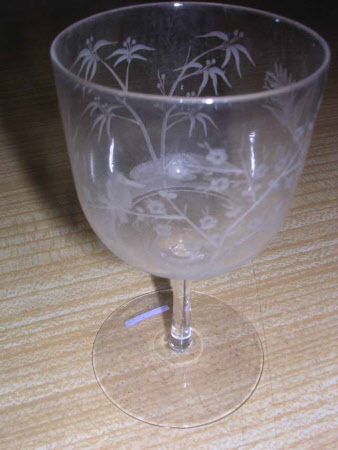 An English glass part drinks service comprising, six decanters, four with stoppers, twenty-one wine glasses and two sherry glasses. Decoration includes engraving of cranes on an island amongst reeds and shrubs, birds in flight and others perched on branches of flowering prunus with fish swimming in the waters about them.