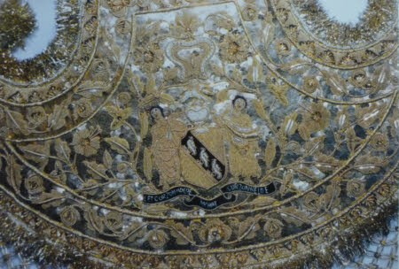 Indian ceremonial garland and garland fragments. The longest part of the garland has an axe shaped central section. This is heavily embroidered in gold spangles and bullion. From the lower edge there are long gold tassels tiered and interspersed with green, brown and one blue bead. There is a knotted section between the axe shape and the fringing, this is covered with bullion and interspersed with gold spangles. The central design is of two figures. The motto say "LET CURZON HOLDE WHAT CURZON HELDE". Seed pearls have been used in the embroidery along with spangles. There are red and blue velvet pieces also used on the decoration. This section is edged with gold fringing. In addition to the main garland, there is a lion and unicorn roundel from a large garland. It has a large roundel with a lion and a unicorn in the centre. At the top there are four strands of tasselled fringing and at the bottom there are clumps of the folded ribbon chains. There are two green discus shaped decorations covered in satin and heavily decorated with leaf and braid shapes. There end with gold metal fringing. The roundel is worked in gold spangles, gold bullion and silver bullion. It is made up on a card base. The design feature of the roundel is that in the centre there is a basket woven area in bullion. There are two more roundels that match the lion and unicorn roundel but do not have any attachments. There is also a ball made of fibres and wrapped in a spangle-covered braid.