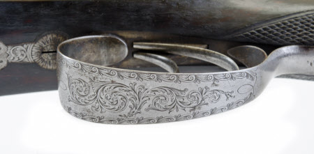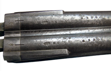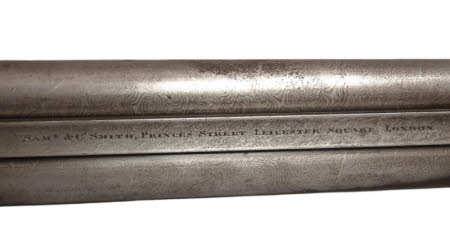 A pair of fine quality double-barrelled percussion sporting guns, c1840, by Samuel and Charles Smith, gunmakers, Princes Street, Leicester Square, London. (fl. 1834-69). Barrels; Double side-by-side round iron barrels of fine Damascus twist construction, with upper joining rib. The breech end signed, SAML. and C. SMITH, PRINCES STREET, LEICESTER SQUARE, LONDON, together with the serial numbers 1 and 2. Bead fore-sight. Stamped on the underside with Serial Numbers 6330 and 6331 respectively, together with London proof marks and the initials HS. The engraved breeches stamped with Serial Numbers 6330 and 6331 respectively and incorporating platinum safety vents. The barrel tang finely engraved and numbered. Secured to the stock by 1 barrel slide. 1 ramrod present - 1 ramrod missing. Length 76.2cm Calibre 18mm. Stock; Figured walnut half stock with chequered wrist. Finely engraved steel furniture comprising; butt-plate the tang engraved with Serial Numbers 6330 and 6331 respectively, trigger guard, fore-end cap and 2 ramrod pipes. Blank retangular escutcheon behind barrel tang. Double triggers. Locks; Right and left hand percussion locks with foliate and pheasant engraving, signed SAML. and C. SMITH, PRINCES STREET, LONDON. Hammers chiselled with a diamond/basket weave design. Overall length 118cm Condition (Code 4) Barrel - some rust patches; one ramrod missing; 1 barrel slide missing Stock - good Lock - good