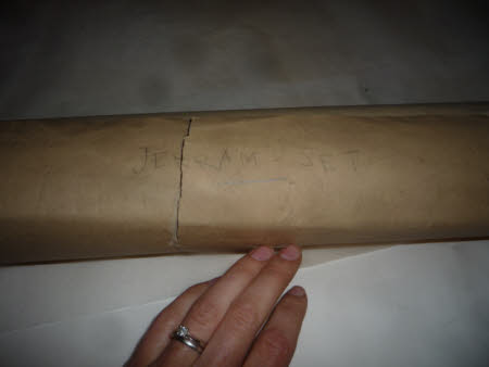 An architectural plan of Kedleston Hall: basement plan. The plan is drawn in ink and watercolour on heavy paper. The drawing is entitled "KEDLESTON HALL / DERBYSHIRE". The plan is drawn by Naylor & Sale Architects and is drawn from measurements taken in December 1920. "JERRAM'S SET" is written on the back.