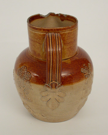 Doulton Lambeth two-colour stoneware jug, cream and brown with embossed scenes of country life. Strap handle with leaf design onto jug body. Circa 1850.