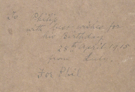 'To Philip with best wishes for his Birthday, 28th April 1915 from Lulu for Phil'.