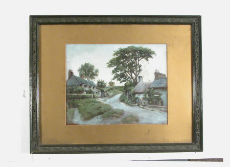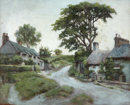 Oil painting on oilboard, Cottages on a Roadside, possibly Philip Yorke II (1849-1922). View of a road winding up to right with cottages to left and right. Possibly Chilton Foliat, near Hungerford whichwas the parish of Reverend Thomas James Scott (d. 1907) who was the father of Louise Matilda Scott who married Philip Yorke II (1849 - 1922) in 1902.