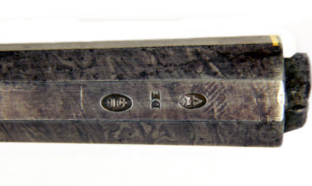 A flintlock sporting gun, c1784/5 by Durs Egg, re-locked by John Manton in c1805. Durs Egg, born Switzerland 1748, worked in London from 1772 and established shops in various locations such as Princes St, The Haymarket, The Strand and Pall Mall. He supplied fine quality firearms for Londons elite and became gunmaker to George IV and the Duke of York. He died in 1831. Many of his sporting guns are among the Royal Collection at Windsor. John Manton, born in 1752, worked in London from 1781. He established a shop in Dover St. Piccadilly, supplying firearms of the highest quality to London’s elite and was appointed Gunmaker in Ordinary to George IV in 1831. He died in 1834. Associated item: gun case POW/F/521 by John Manton. Round Stub twist iron barrel, formed in 2 stages, octagonal at the breech then round to the muzzle. The underside with a lower rib and 2 ramrod pipes. The breech with a gold line and inset gold makers mark, Durs Egg, London. The underside of the barrel stamped with the proof marks of the London Gunmakers Company and the initials DE (Durs Egg). Gold lined touch-hole. Bead foresight with silver “spider” form decoration. Engraved false breech (with sighting channel) and barrel tang. Retained to the stock by 2 barrel slides, each with silver escutcheons. Whale-bone ramrod, the forward end with a steel tip, the rear with a steel worm. Barrel length 92cm. Calibre 12mm. Walnut half stock, chequered at the wrist in a broad diamond pattern, and with a carved “flower” motif behind the barrel tang. Engraved steel furniture comprising; buttplate, trigger guard with decorative pineapple/pomegrante finial, and fore-end pipe. Silver escutcheon to the wrist engraved with the Clive family crest. Flintlock, the flat plate with a bevelled edge engraved, the tail of the plate engraved with a rabbit. “French” form cock, waterproof pan and with an anti-friction roller to frizzen spring. Signed beneath the pan MANTON. The top jaw and screw missing. The frizzen (or hammer) formed with a “lip”, which was patented by Joseph Manton (John Manton’s brother) in 1803. Retained to the stock by 1 sidenail. Overall length: 131.3cm