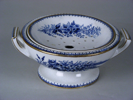 Oblong toothbrush holder, part toilet set, shallow curved sides, raised on foot ring, dome cover with scroll handle. Transfer printed under-glaze blue decoration, large sprays of various flowers; fleur de lys and dagger borders. Gilt line highlighting.