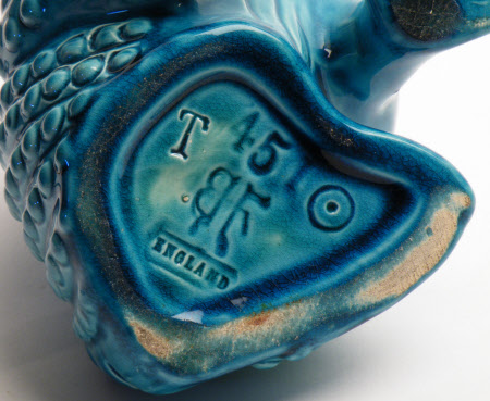 An earthenware spoon warmer, covered with translucent turquoise glaze in the shape of a bullfrog. The bullfrog [or frog] may be based on the three-legged toad, which was the attribute of the 10th-century Chinese scholar Liu Hai. Stamped with stylised 'B F' for 'Burmantofts Faience' with the shape number '451' denoting it is a grotesque bullfrog [or frog] spoon warmer. This Burmantofts mark was in use from 1882-1904.