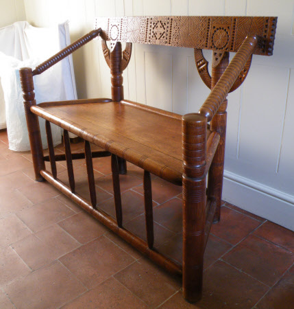 An oak settle or hall bench, made by Thomas Henry Kendall of Warwick in 1894 for Standen. The open back with profusely chip-carved toprail of geometric patterns, raised on turned column rear supports with wings, the arms sloping downwards to ring-turned front posts and the trapezoid-shaped seat raised on a spindle-turned gallery.