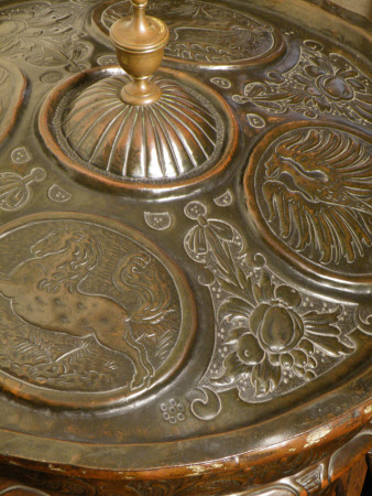 A tapering, cylindrical beaten bronzed metal log bin with decorated lid and leather carrying straps. Probably made in Nuremburg about 1900 for the German tourist trade. It resembles a container used for grape gathering. The various beaten figures represent a man and woman in mediaeval style costume with a castle in the background, and a variety of mythical birds and animals. The lid has a brass urn-shaped knob.