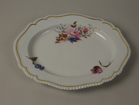 Four oval platters, of eight of graduating sizes, part of a large Flight, Barr and Barr Worcester part dinner and dessert service, the gadroon rims edged with gilt line, the centres painted with floral bouquets, impressed FBB and crown and printed manufacturer’s mark, c.1813-40