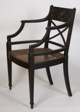 A black-japanned and painted cane-seated open armchair, English, circa 1860 in the Regency style, by Morant & Co., of New Bond Street, London Painted with reserves of flowers between foliate sprays, and with a back of crossed slender splats, and open arms flanking a cane seat. On tapering square-section legs with moulded collars to the feet. The rear legs outswept. Although Regency in form, this chair is a later revival of the style, painted with sprays of flowers in the Victorian taste. Morant & Co. were one of the best cabinet-makers of the 19th century, and frequently revived earlier styles.