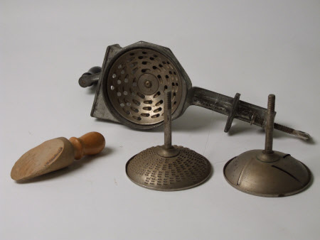 A cast alloy vegetable grater (A) with a clamp for attaching to a work surface; a wooden pusher (B); two interchangeable grating discs (C and D).