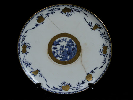 Set comprising 3 low cake stands, 2 tall cake stands and 9 circular plates. Decorated in underglaze blue, central Willow pattern medallion, transfer printed, scrolling foliage and diaper border. Gilt blossoms and oriental border.