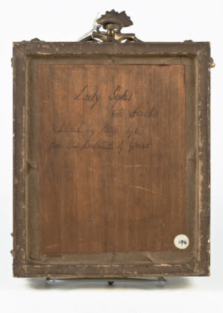 Portrait miniature, chalk on cartridge paper, Mary Anne Foulis, Lady Sykes (d.1861) (after Sir Francis Grant PRA), by Miss Sykes (fl.1850). c.1850. Rectangular. Whole-length portrait of a woman, seated, turned to the right, gazing at the spectator, wearing a black dress, trimmed with lace, red shawl, flowered cap. Light brown eyes, dark curled hair. Buff curtain background and window to right with tree and sky. Reduced head and shoulders from a portrait by Sir Francis Grant, P.R.A.