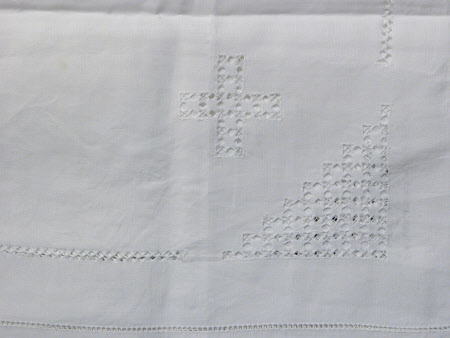 Cloth; Teacloth - Square white afternoon teacloth with drawn thread work and white knitted lace border. Drawn thread work crosses and stepped triangles in the corners.