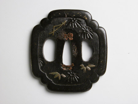 Hand guard - Tsuba (sword hand guard). Bamboo leaves, Mito style with copper and gold relief. Sticky label with unidentified no '72' on reverse.