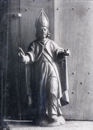 Glass photographic negative plate. Depicting (statue of) a Bishop, part of the collection at Snowshill Manor. Original glass plate envelope present. Some discolouration.