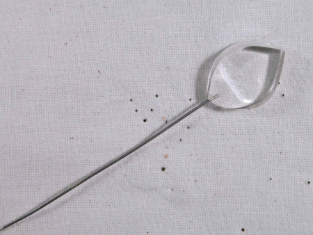 White metal hat pin, clear perspex plastic petal shape head