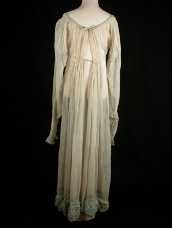 Dress- White muslin, bodice with high waist gathered at centre front and back. Pulled up around neck brie en coulisse bound with pale blue ribbon. Inner sleeve short and puffed, bound with light blue ribbon. Very long oversleeves worn scrunched up and gathered above wrist by four rows of blue ribbon in casing. Blue cord at wrist, frill over hand embroidered chain stitch flowers in blue wool. Tie around wrist with blue bow. Fastens at CB, skirt attached straight at front gathered at CB. Scalloped lower edge, embroidered in blue wool and trimmed with gathered circles of emberoidered muslin at the centre of each is a small blue pom pom.