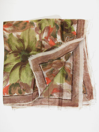 Scarf; Headscarf of silk and rayon printed in broadly painted floral design, in lime green, donkey brown and coral red. 26 in square (edges frayed). 1950 (circa)