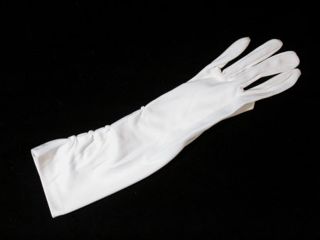 One of a pair of lady's gloves, white bri-nylon jersey mid-forearm length with stitched detail made by Dents. In original polythene bag. 1950 - 1960 (circa)