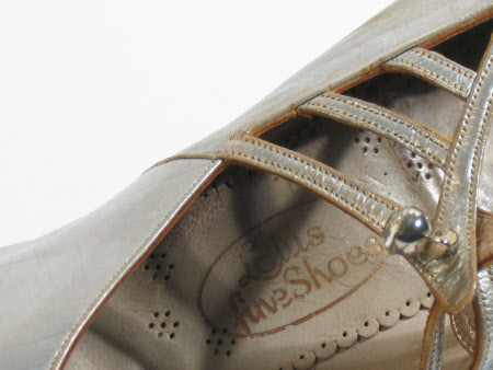 One of a pair of silver leather evening shoes, 'Lotus fine shoes'. Shaped high heel, long rounded toe, fancy instep strap with diamante button. Size 6, well worn. 1920 (circa)