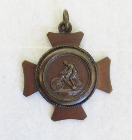 A black medal case containing a bronze cycling medal. The reverse is engraved "Leys BC Slow Race 2nd Prize won by F. Pretty 1896".