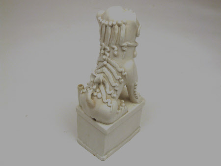 One of a pair of Blanc-de-Chine joss stick holders in the form of Buddhistic lions, one with his left and one with his right foot resting on a ball, on rectangular bases. Some repairs (see also General Note).