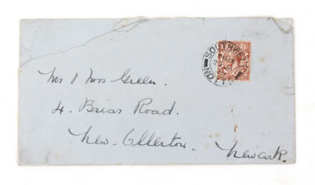 A set of four blue envelopes containing a total of five letters. Letters written by Matron at Galley Hill Isolation Hospital, Southwell to parents of an infant patient.