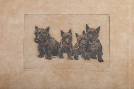 Pen and ink drawing on paper, Four Scottie Dogs by Meta Plückebaum (Dortmund 1876 - Dusseldorf 1954), signed in pencil lower right: Meta Pluckebaum and lower left: Four dogs with red collars. False drawn mount lines. Mottled paper. Framed, glazed.