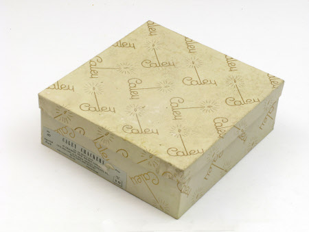 Square cardboard box and lid covered with cream paper printed in beige with the name Caley in a stylized way. Contains assorted Christmas decorations.