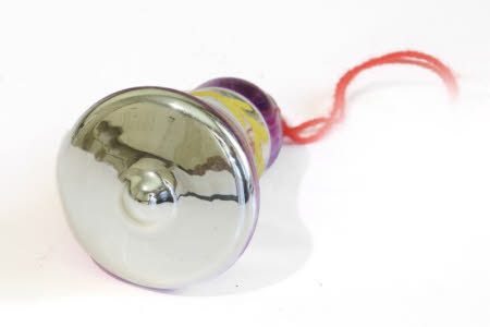 Square cardboard box and with lid covered with yellow paper containing a number of Christmas tree decorations.