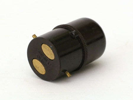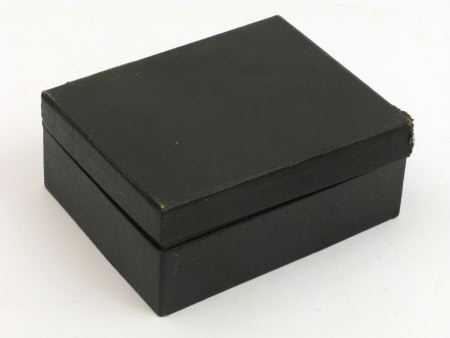 A number of light fittings, an elecrtic bulb and electric plugs in a cardboard box covered in black paper and fabric, with fabric hinge. Interior divided into three compartments by card dividers.