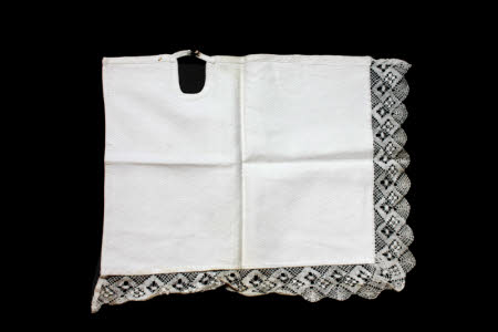 Three white cotton dressing table mats, with diamond weave. Each with lace edging on two sides and U-shaped cut outs, with narrow straps and hook and eye fastenings for attachment to dressing table.