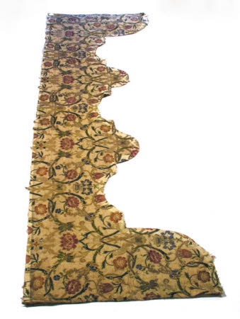 Three pieces of heavily embroidered fabric unpicked from pelmet stiffening and two curtains from Eton Room.