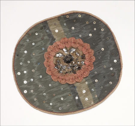 A home-made circular sewing box in green grosgrain with lid and associated contents.