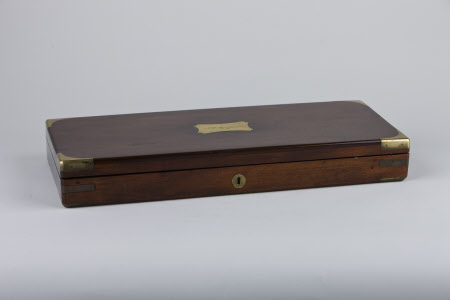 Pair of duelling pistols. Silver mountings and trigger guards. One pistol with broken cock and trigger, firing pin missing. One pistol with replacement screw in cock. Ramrods missing. Mahogany case inscribed 'J.H. Wakefield, R.N.' Powder horn, balls and flints in case. (see SPR/AA/593.3 for case)