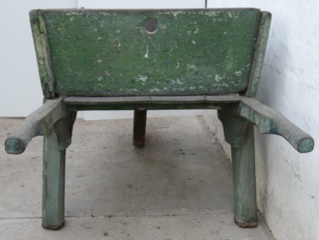 Green painted timber wheelbarrow with removable sides, iron shod wooden wheel painted red with four spokes plus additional spare eight spoked wheel, painted green with iron rim.