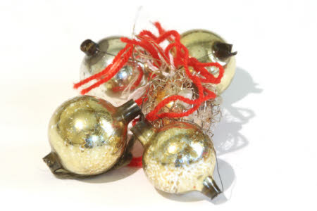 Cardboard box with fold out lid, containing an assortment of Christmas tree decorations.