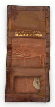 Square, brown textured folding leather case of two equal halves. Inside the top is marked; E. HAUTEOCEUR / 35. AVENUE DE L'OPERA. Lower half - leather square with square hole cut out. Inside lined with shot silk. Contains three base metal tokens or discs tied together with string.