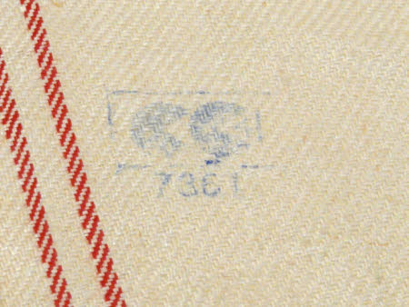 Kitchen cloth in red and cream twill weave linen. Pattern of red double lines around edge with; ALL LINEN KITCHEN CLOTH ALL LINEN. Selvedges both sides with double edged machined bottom. A blue stamp in bottom LH corner with blue outline and two blue faded circles with a piece missing and the number; 7361.