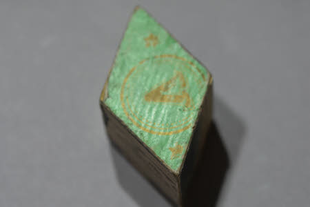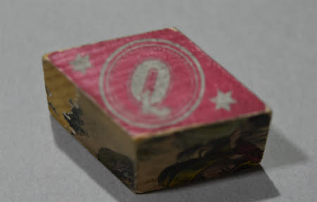 Set of six diamond shaped wooden blocks, some with letters printed on.