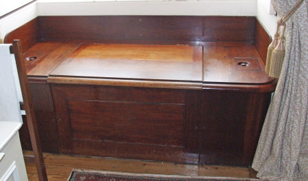 Mahogany toilet with hinged lid and hinged seat flap, and two smaller hinged compartments with inset knobs. White china bowl with bakelite flush handle in brass fitting inset on left. Bowl inscribed 'Cymplur, John Balding & Sons Ltd, Grosvenor Works, London'.