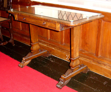A rosewood, holly and ebony inlaid games table, English, circa 1820, The rectangular top with a sliding center section revealing a backgammon board and inlaid with a chess board above false drawers to either side on end supports with double scrolled feet.