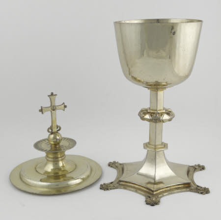 A pair of silver gilt covered chalices. Each chalice with a six sided incurving base coming to points formed out of six cast angels heads. The stepped base tapers to a six sided columnar support with a plain knop and crudely engraved central knop. The cover is stepped to a baluster neck and engraved above with a sunburst and surmounted by a cross and orb. The bowl is engraved with the inscription 'Christ the Shepherd'. This plate is related to plate made by the same goldsmith at Gloucester and Rochester Cathedrals, Fulham Palace and elsewhere. The communion cups and covered patens are particularly interesting in that, like certain other plate of the same period, they show an attempt to revive Gothic features associated with the work of the silversmiths of the fifteenth century. (Church Guide, last printed 1990 with additions 1990).