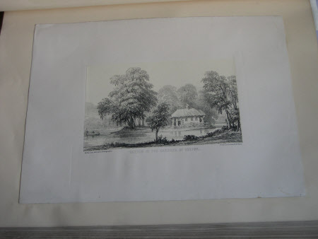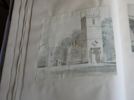 Green album with black leather half binding embossed with gilt lilies. Contains a collection of prints, drawings and watercolours of various dates relating to Belton. Includes a description and photographs of the original water pumps at Belton House, the contents of an address to the Earl Brownlow, a print of the silver casket containing the address, picture of Belton House exterior, interiors (includes Red Drawing Room, Old Library, Chapel) and gardens, interior views of Belton Church watercolour of Belton Church by J C Buckler and lithographs of the same by Amelia and Lucy Cust. A plan for the Belton Garden dated 1881 and the Angel Inn by J C Buckler.
