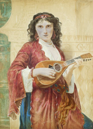 Oil painting on canvas, A Gypsy Lady, dressed in red, holding a mandolin, possibly Camille Victor Louis Muller (Paris 1861 - Paris 1880), signed C.L.Muller.