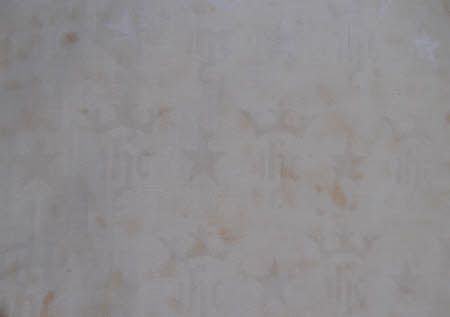 Linen damask altar table cloth. Fine white linen damask cover, woven with self-coloured repeating pattern, including 'IHC', star and crown motifs. Self fringed ends.