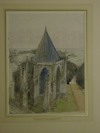 Watercolour on paper, The Chapter House, York Minster, York, by Sir Albert Edward Richardson KCVO, PRA (London 1880 – 1967). Signed l.l. Pencil note on mount 'Given to me by Professor A.E. Richardson, Anglesey Abbey, Christmas 1950, Fairhaven.' Mounted on card.