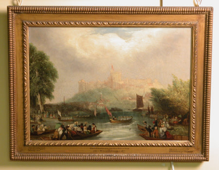 Oil painting on canvas, The Celebration of the 4th June at Eton after William Evans (of Eton) (Eton 1798 - Eton 1877, engraved C.J. Lewis 1837. Numerous figures by and in boats on river in foreground, Windsor beyond, barge flying standard centre foreground. Gilt frame, labelled 'The Celebration of 4th June at Eton. William Evans 1797-1877. From the Collection of J.H. Smyth Pigott of Brockley Hall. Engraved by C.J. Lewis 1837 and dedicated by permission to HRH Prince George of Cambridge'.