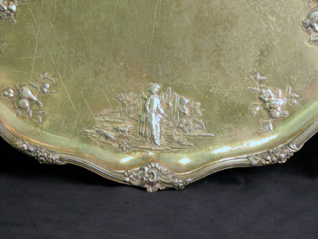 Silver gilt oval rosewater dish or salver, chased with sporting figures, fruit and flowers, reeded and floral border. Gustav Friedrich Gericht, German, Augsburg 1773. Monogram WM and crown on underside. Matches AA/S/89.